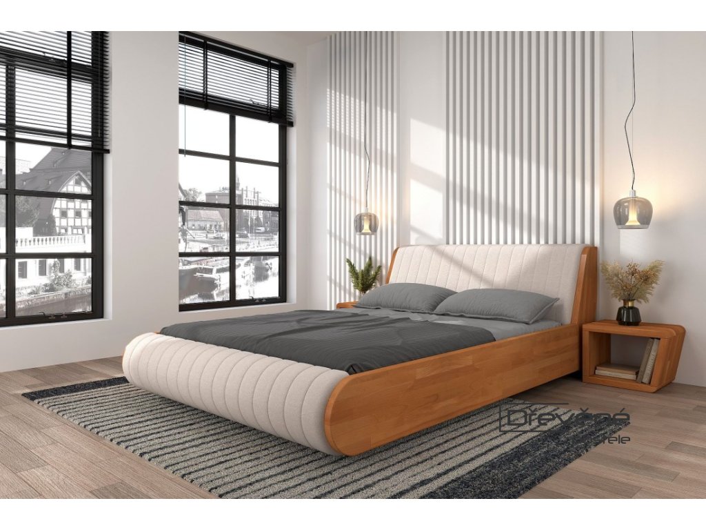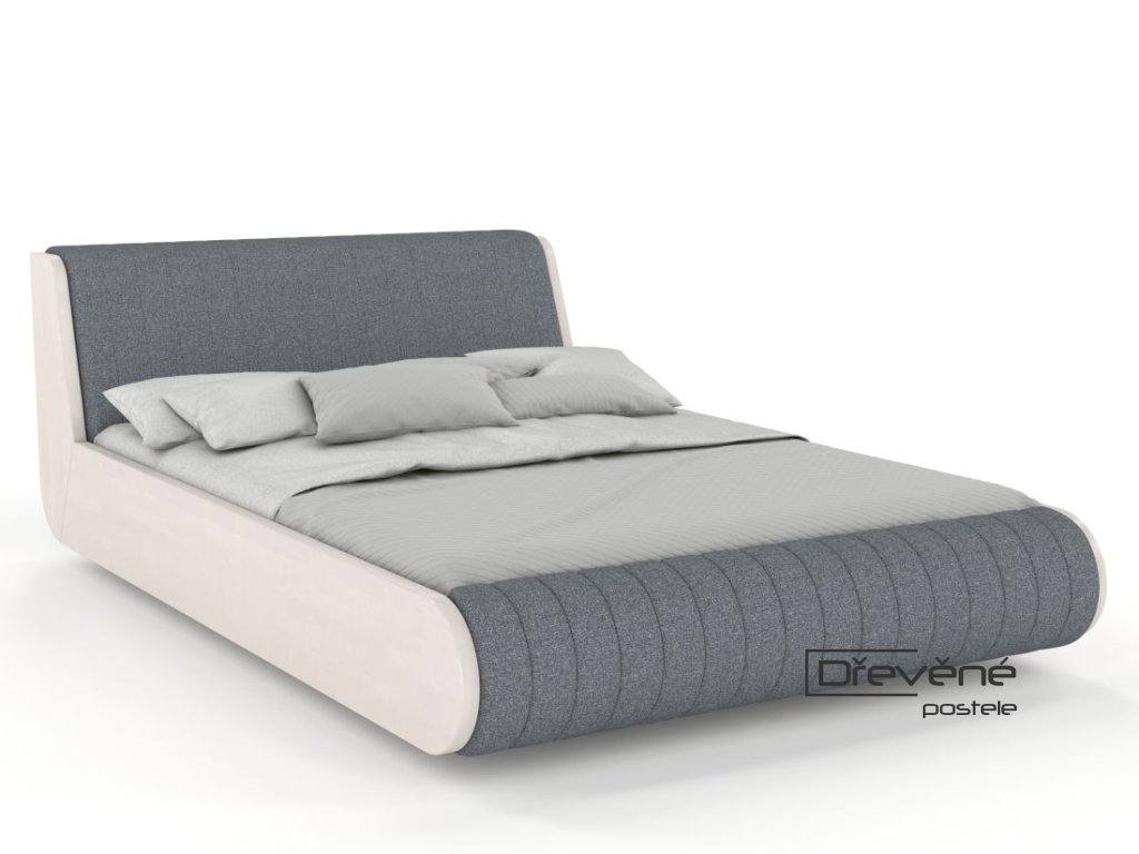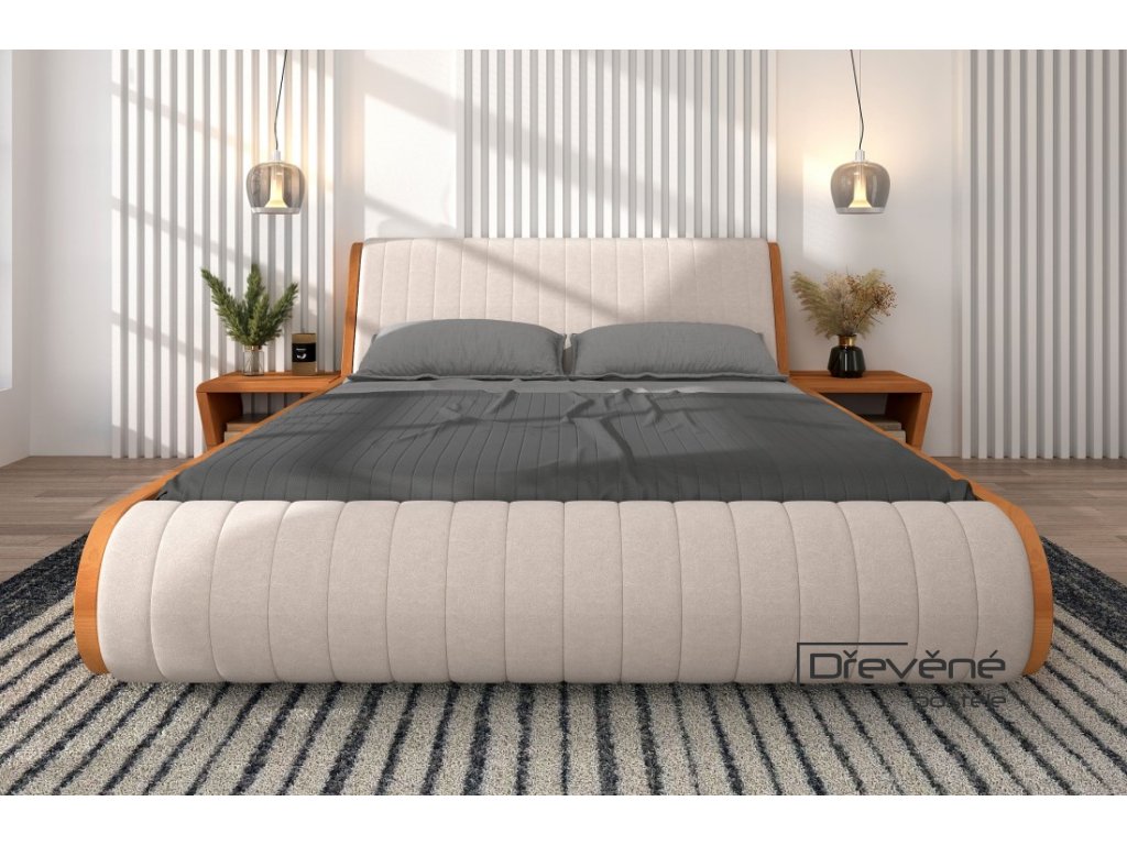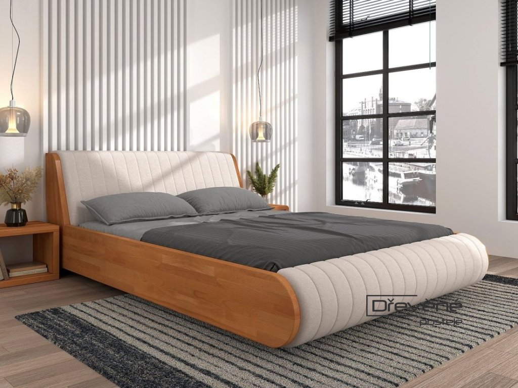Levitující postel z bukového dřeva 4 cm s nosností 400 kg. Na výběr je z několika barev čalounění předního a zadního čela a odstínů dřeva. Do této manželské postele můžete umístit jednu matraci vcelku 180x200 cm nebo dvě matrace 90x200 cm.