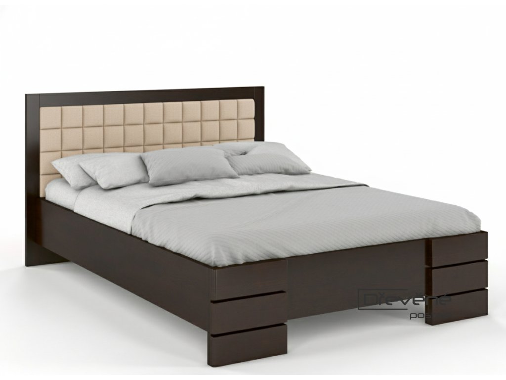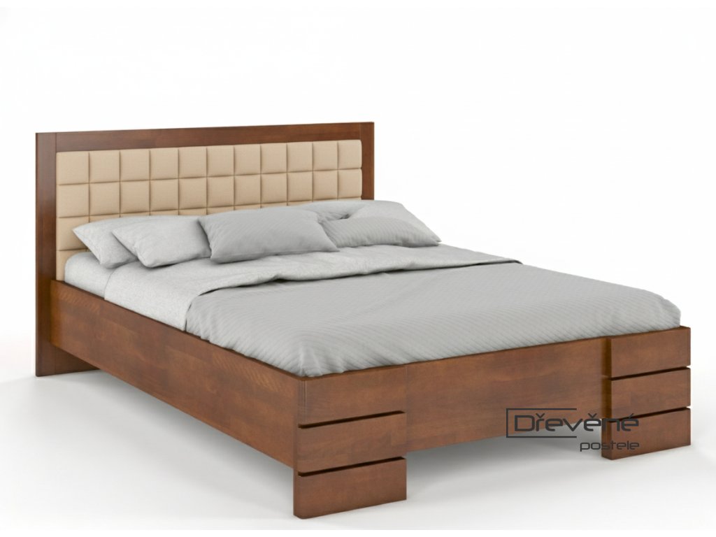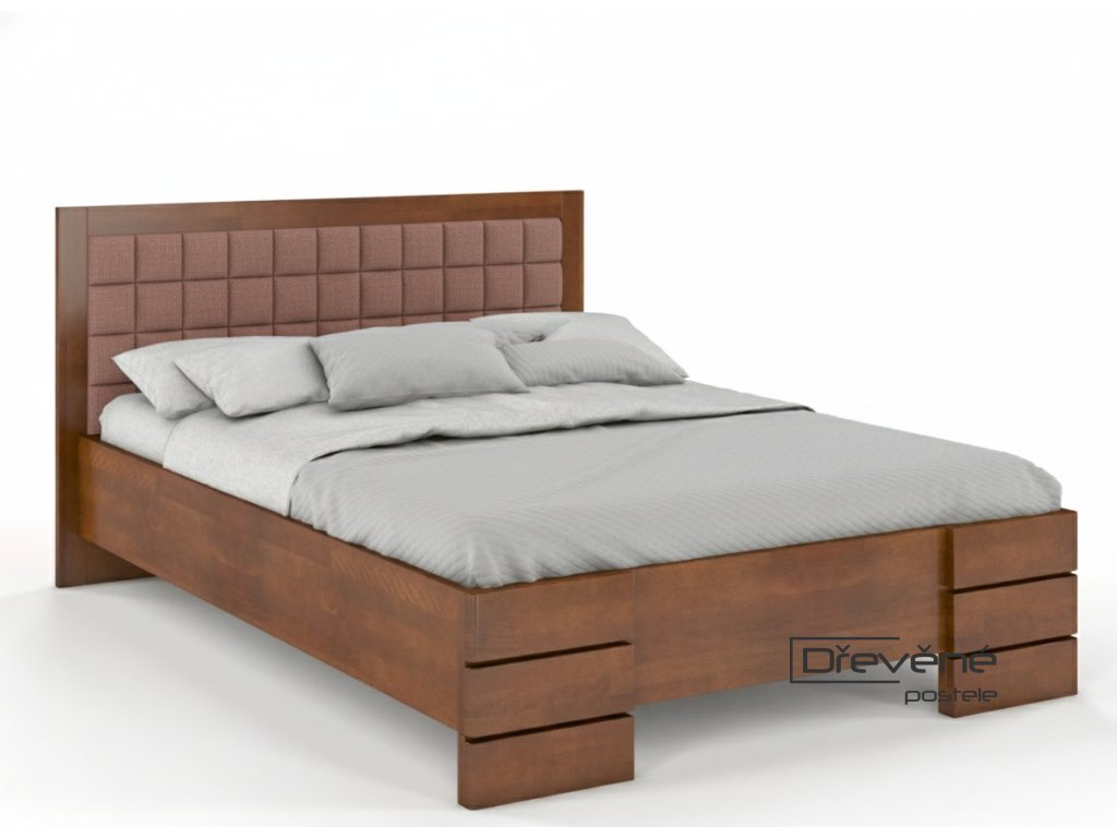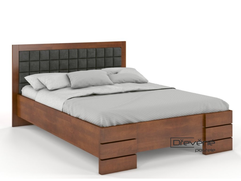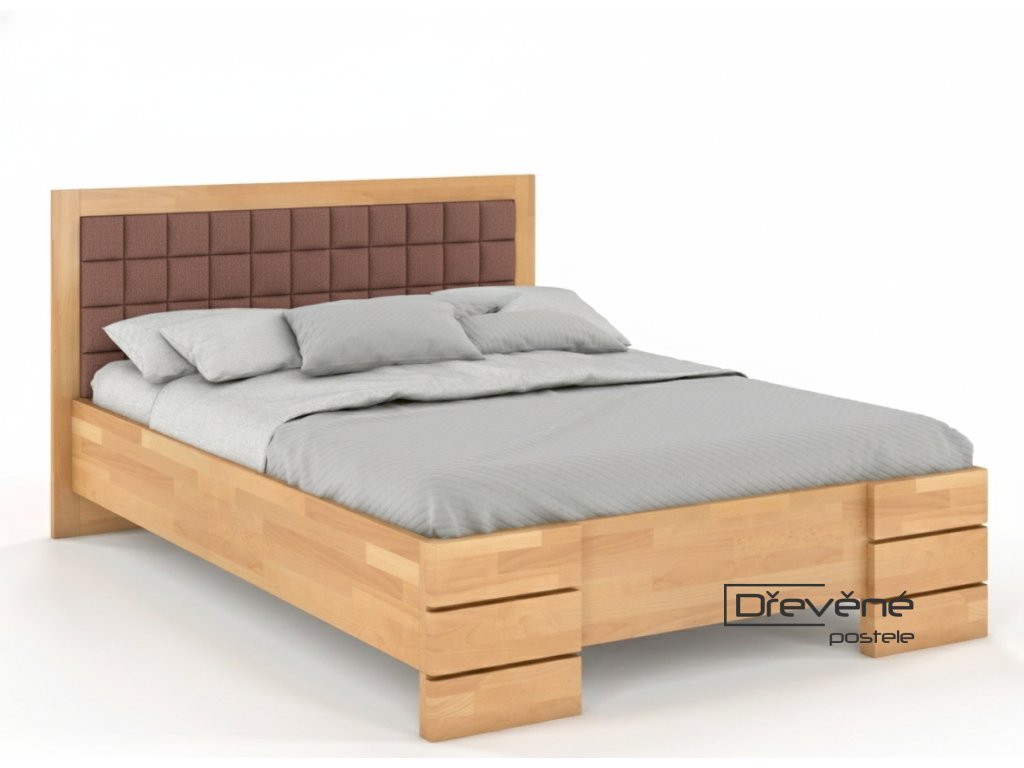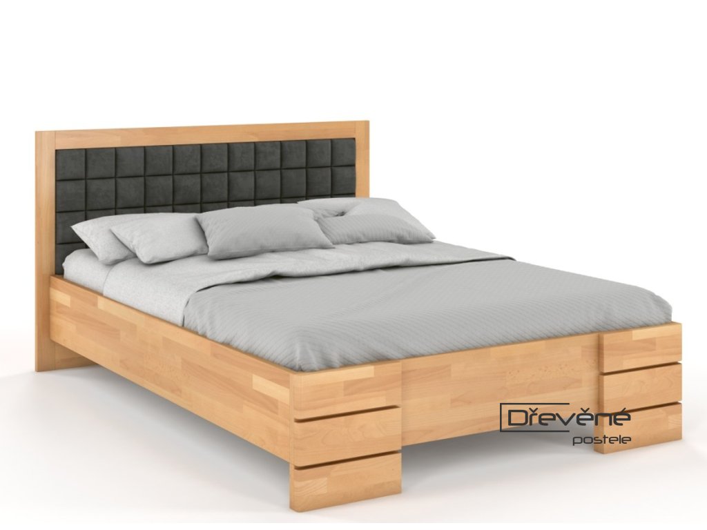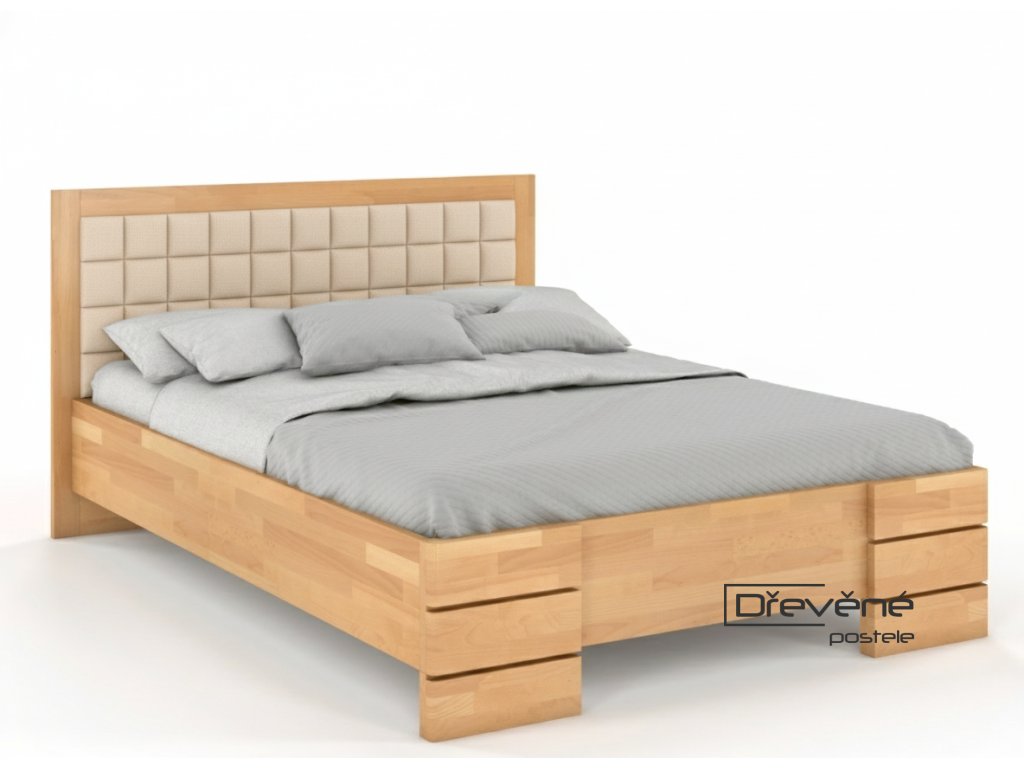 Moderní designová manželská zvýšená postel z masivu buk cink s čalouněným zadním čelem.