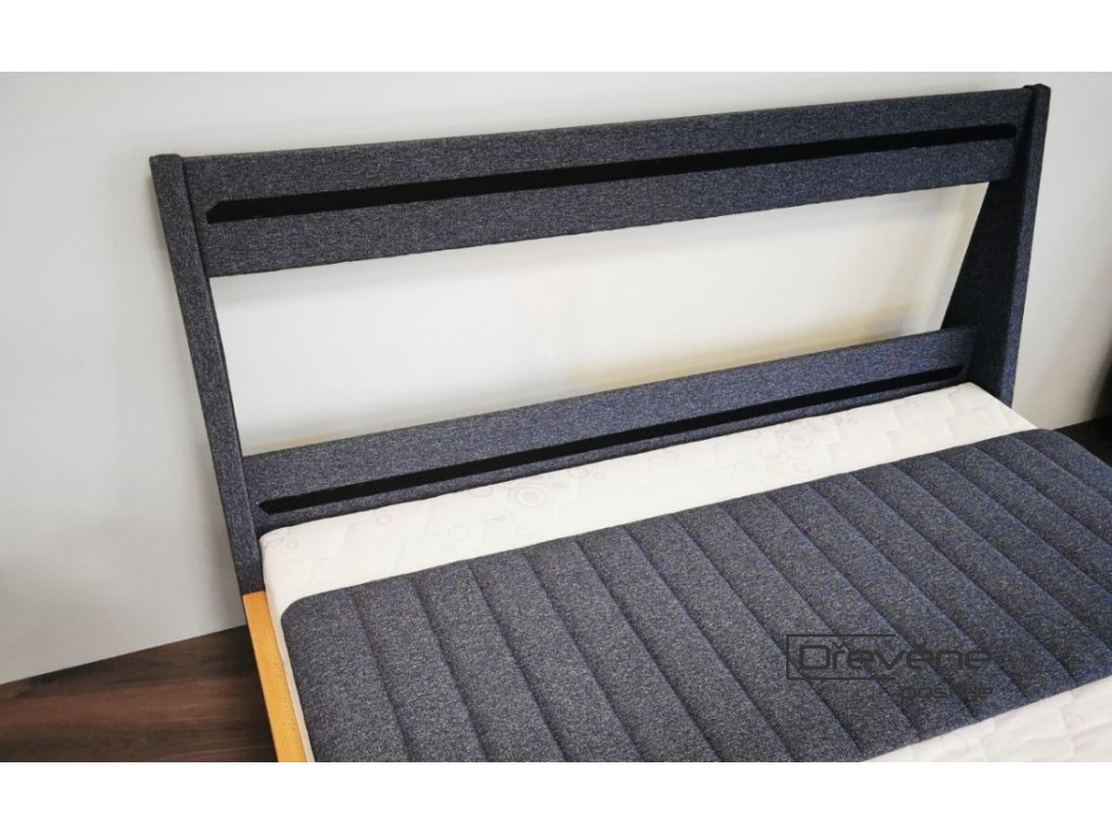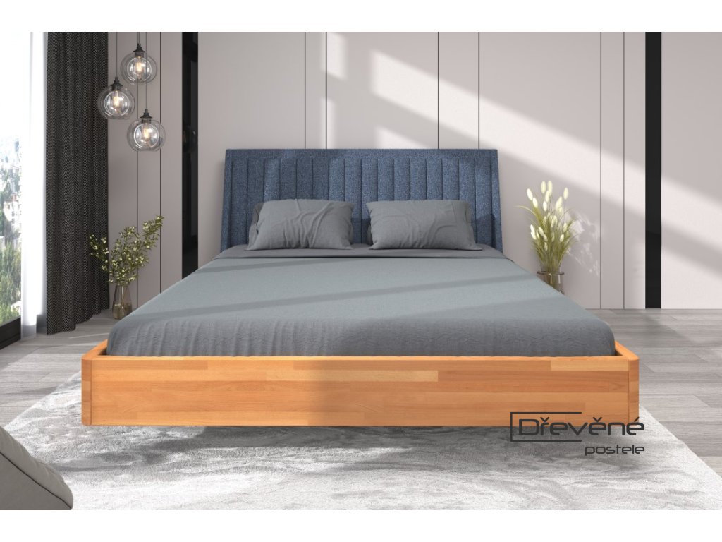 Manželská levitující postel v rozměru 200x200 cm. Postel je vyrobena z tvrdého masivu buk silný 4 cm. Čalouněné čelo za hlavou přispívá komfortu při odpočinku v posteli.