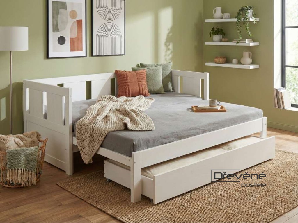 Rozkládací postel s úložným prostorem je vyrobená z masivu borovice s povrchovou úpravou na bílou barvu. Postel jednoduše rozložíte z rozměru 90x200 cm na spací plochu 180x200 cm. Součástí rozkládací postele je praktický úložný prostor a dva postelové rošty do celé postele...