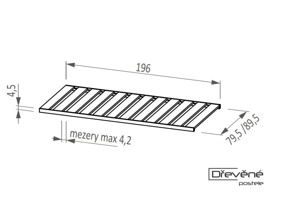 Rošt je dostupný v rozměrech 80x200 cm a 90x200 cm, jeho výška činí přibližně 4,5 cm. Maximální mezera mezi latěmi je 4,2 cm, což zaručuje výbornou oporu pro pružinové i sendvičové matrace. Nosnost do 150 kg umožňuje univerzální použití v klasických i masivních postelích.