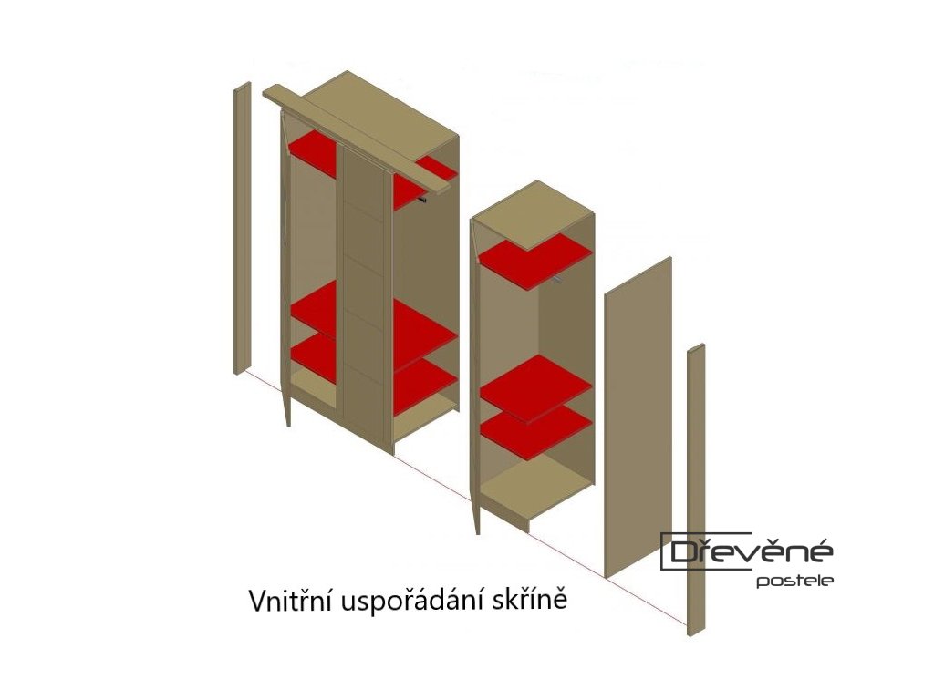 Šatní skříň nabízí praktický úložný prostor s 3 velkými a 3 malými policemi, jednou velkou a jednou malou šatní tyčí, přičemž malé police i obě tyče lze dokoupit.